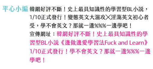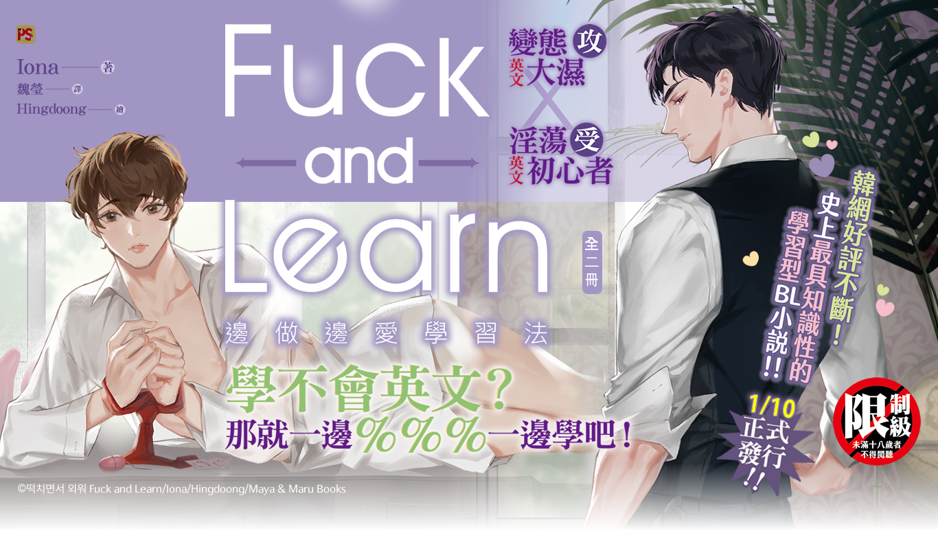繼《過度呼吸》的小說版上市之後,相信大家對韓耽作品意猶未盡,在新的一年,平心又要帶來肉香四溢、誠意滿滿的韓文耽美小說──《邊做邊愛學習法Fuck and Learn》!