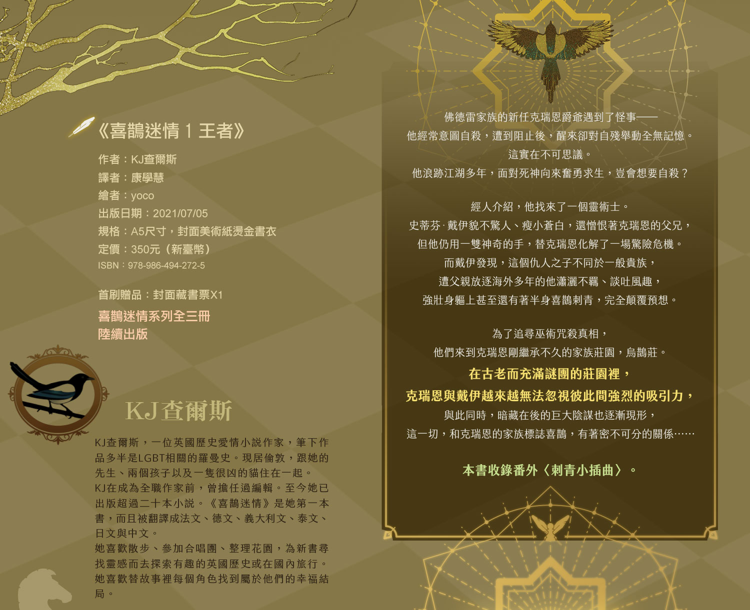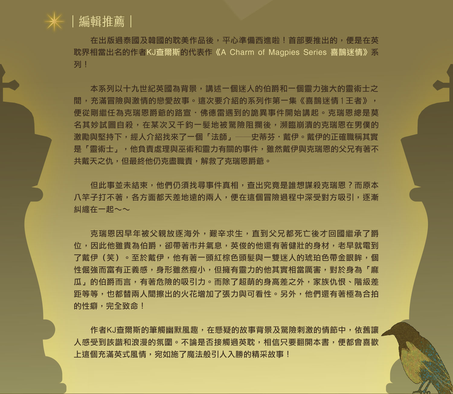 英耽界知名人氣作者KJ查爾斯,不容錯過的奇幻懸疑代表作!——《喜鵲迷情》!