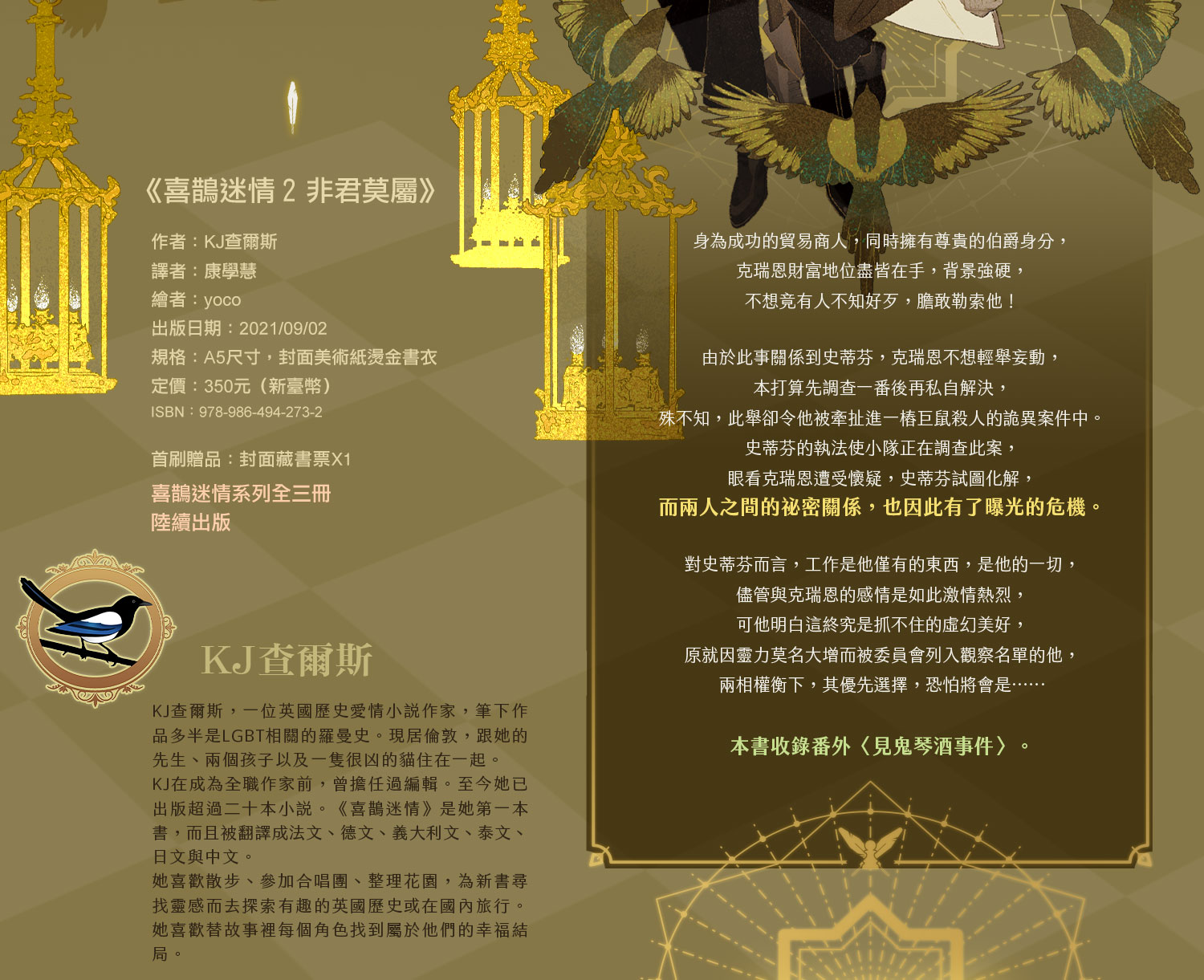 英耽界知名人氣作者KJ查爾斯,不容錯過的奇幻懸疑代表作《喜鵲迷情 2 非君莫屬》!