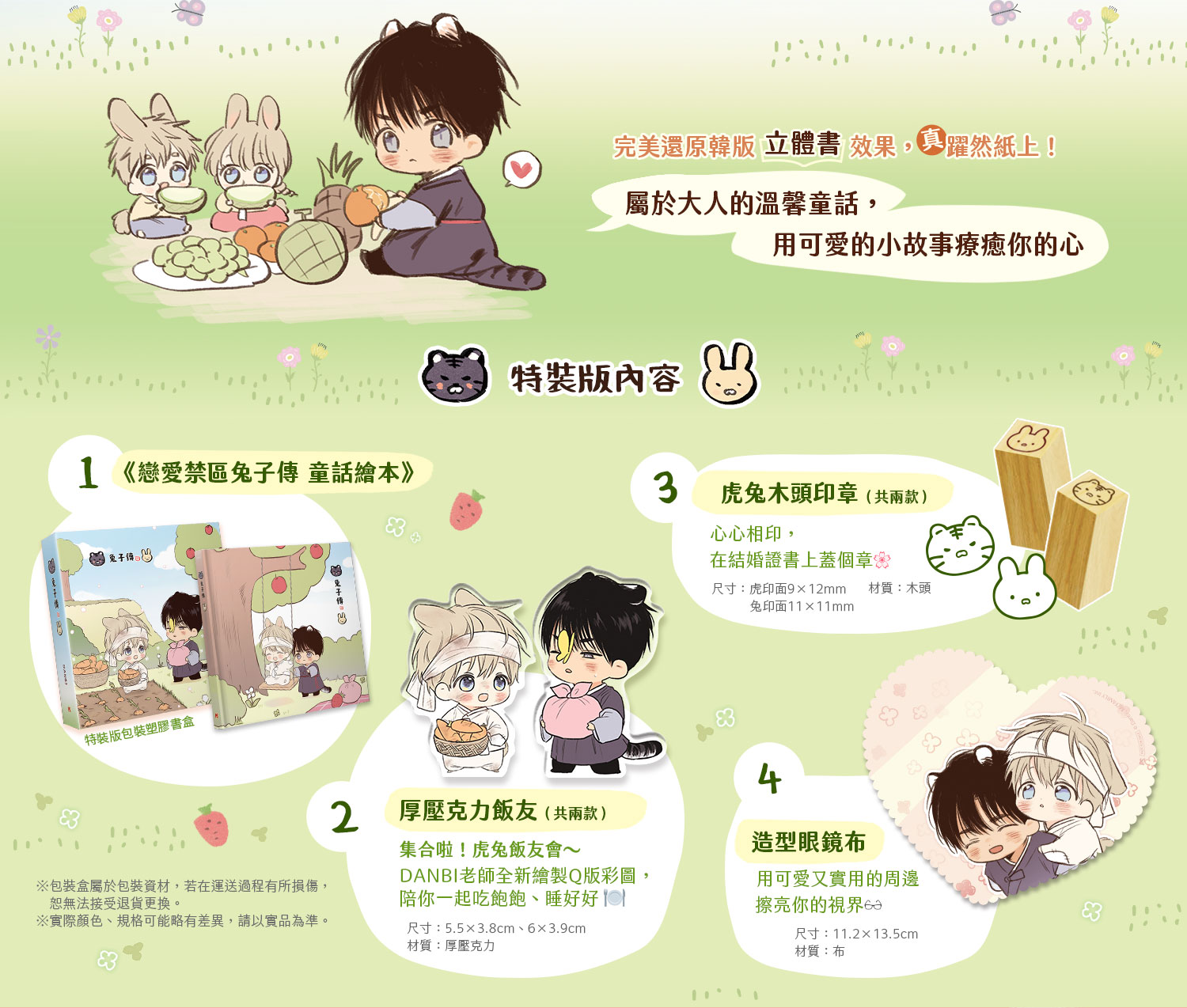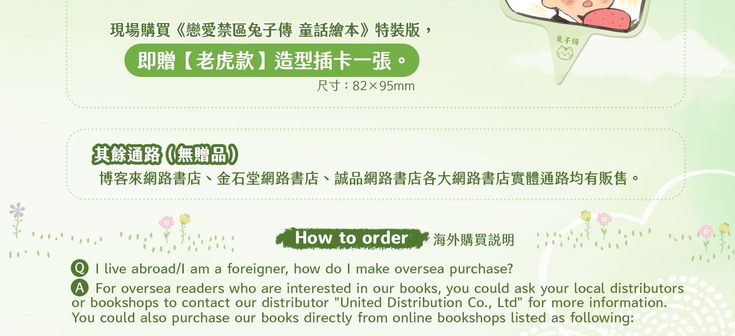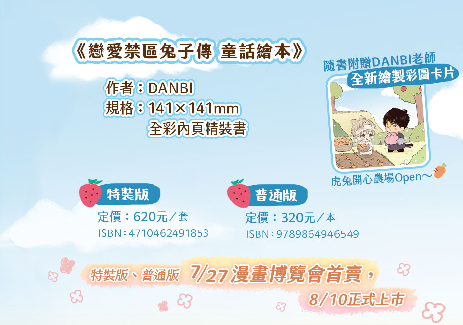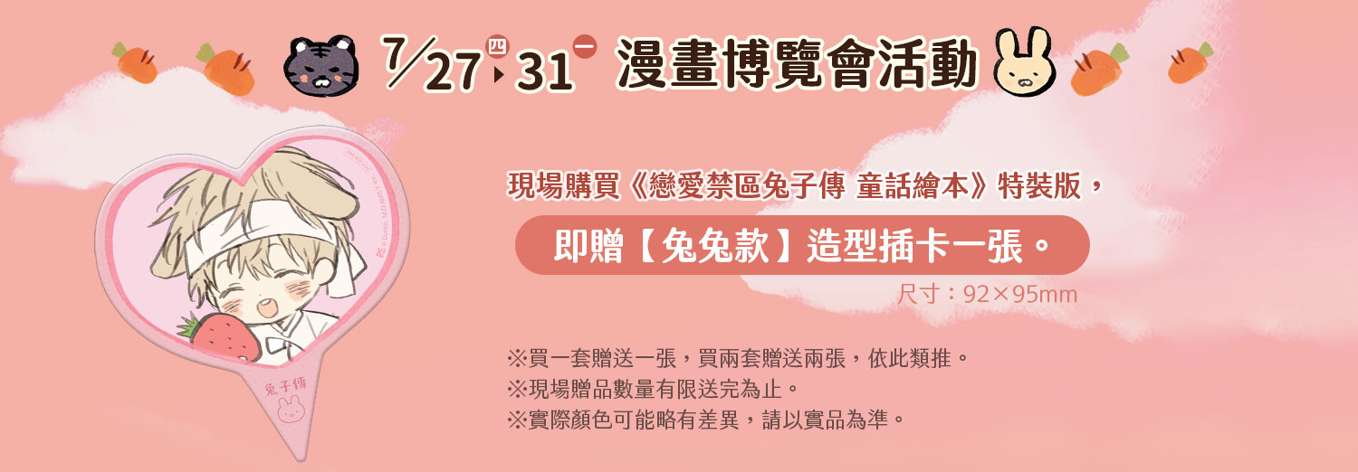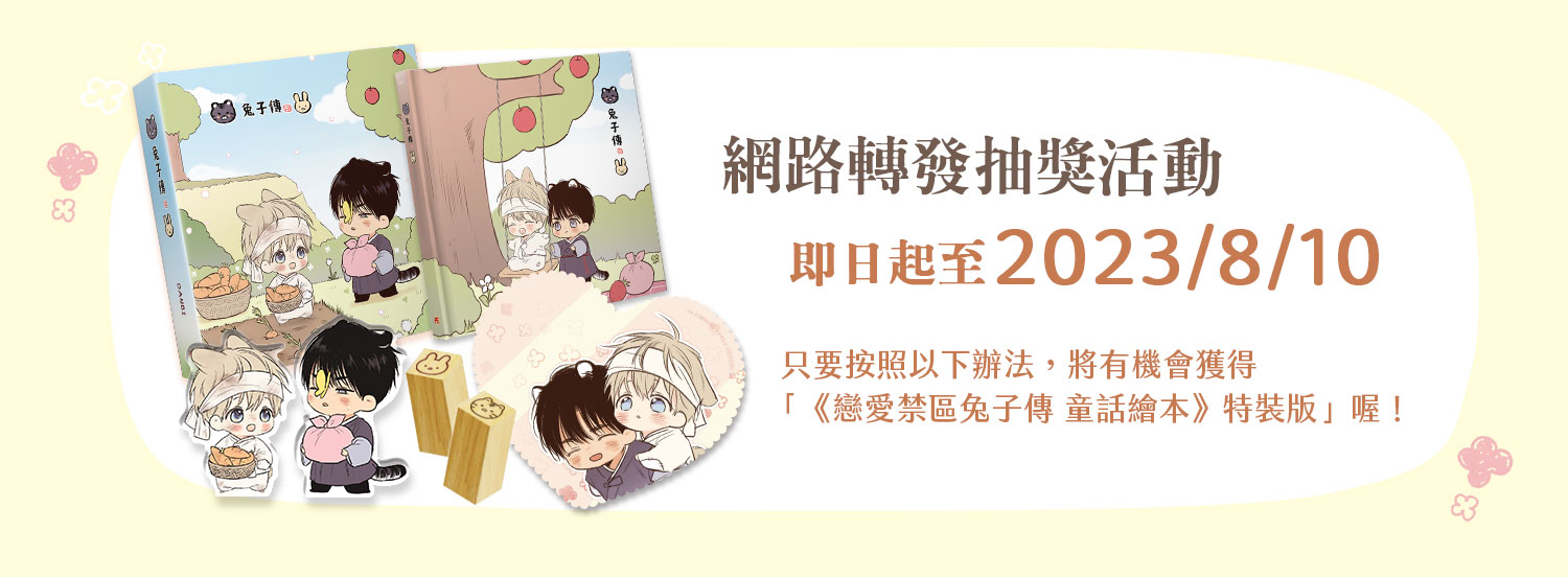 活動時間:即日起至2023/8/10 抽獎時間:2023/8/14 獎品:「《戀愛禁區兔子傳 童話繪本》特裝版」共二名。 活動辦法: 步驟一:請先按讚加入 「平心出版」facebook粉絲團 。 步驟二:公開分享平心出版facebook 《戀愛禁區兔子傳 童話繪本》臉書貼文 ,且 @Tag_____兩位好友,即可參加抽獎!