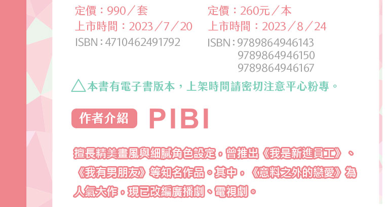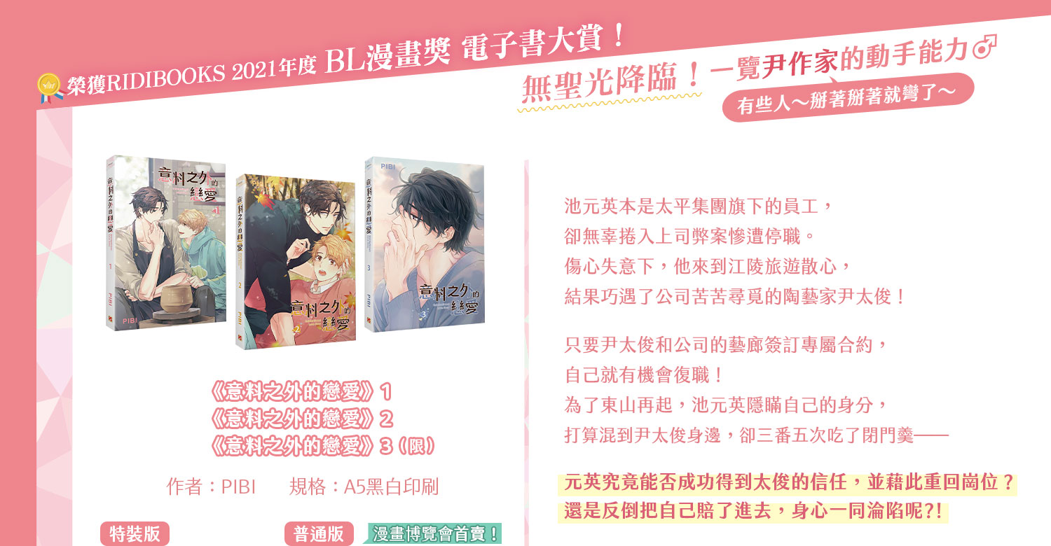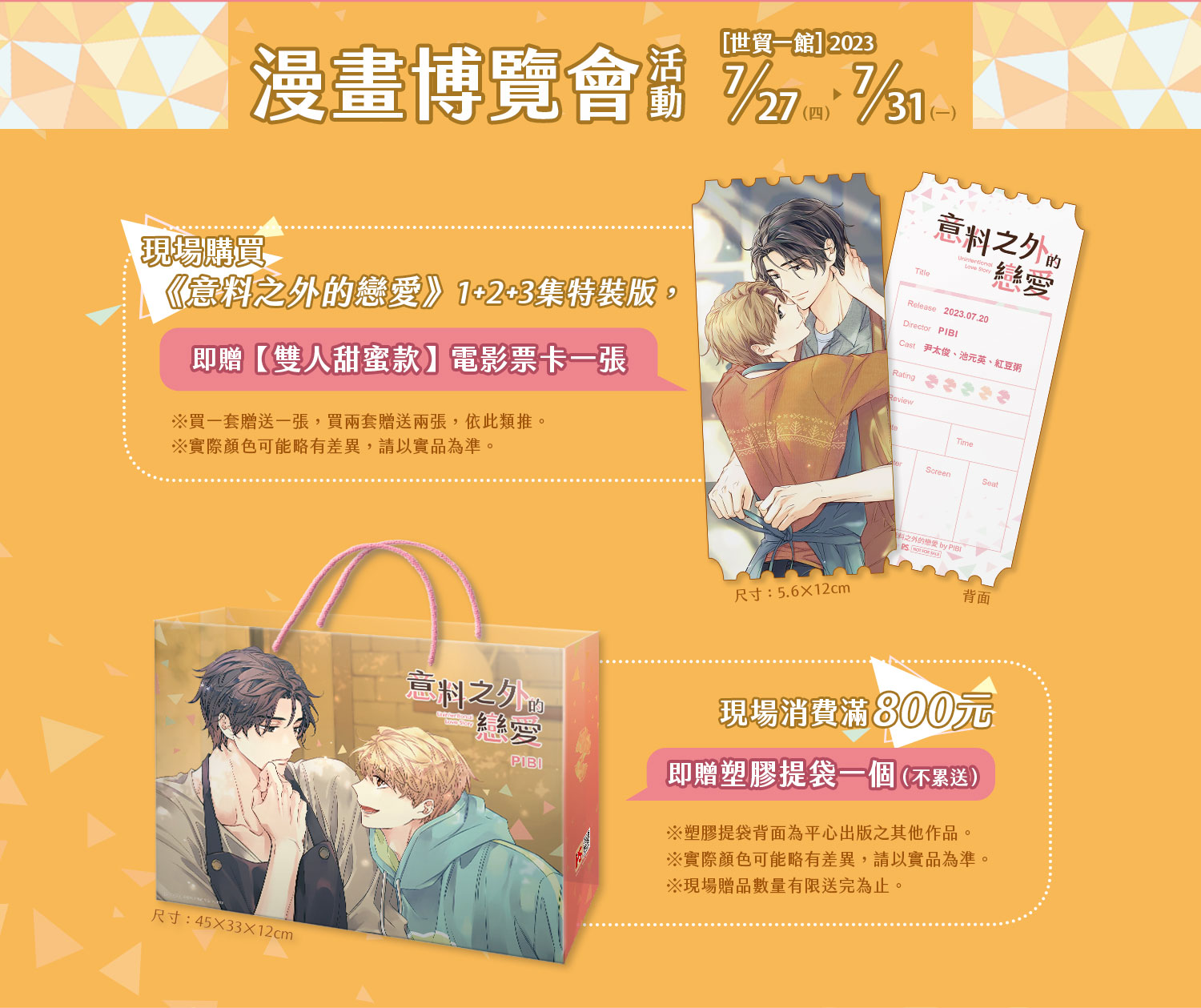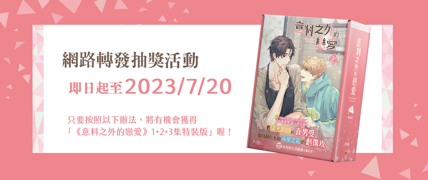 活動時間:即日起至2023/7/20 抽獎時間:2023/7/24 獎品:「《意料之外的戀愛》1+2+3集特裝版」共二名。 活動辦法: 步驟一:請先按讚加入 「平心出版」facebook粉絲團 。 步驟二:公開分享平心出版facebook 《意料之外的戀愛》1+2+3貼文 ,且 @Tag_____兩位好友,即可參加抽獎!